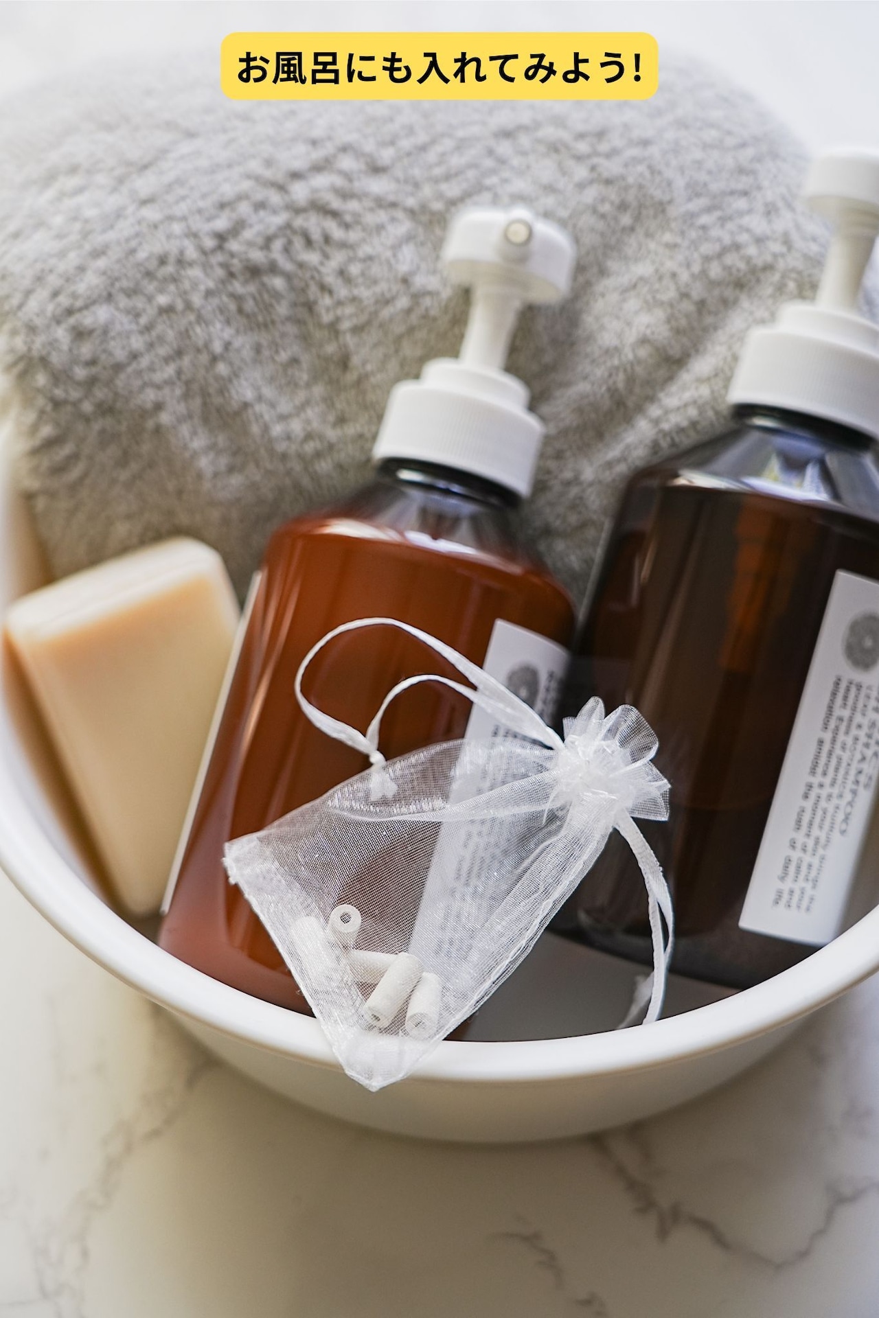 お風呂に入れるときは、5個を付属のネットに入れてください。吸盤などでお風呂の壁に吊るすと便利です。使用後は、天日干ししてよく乾燥させてください。